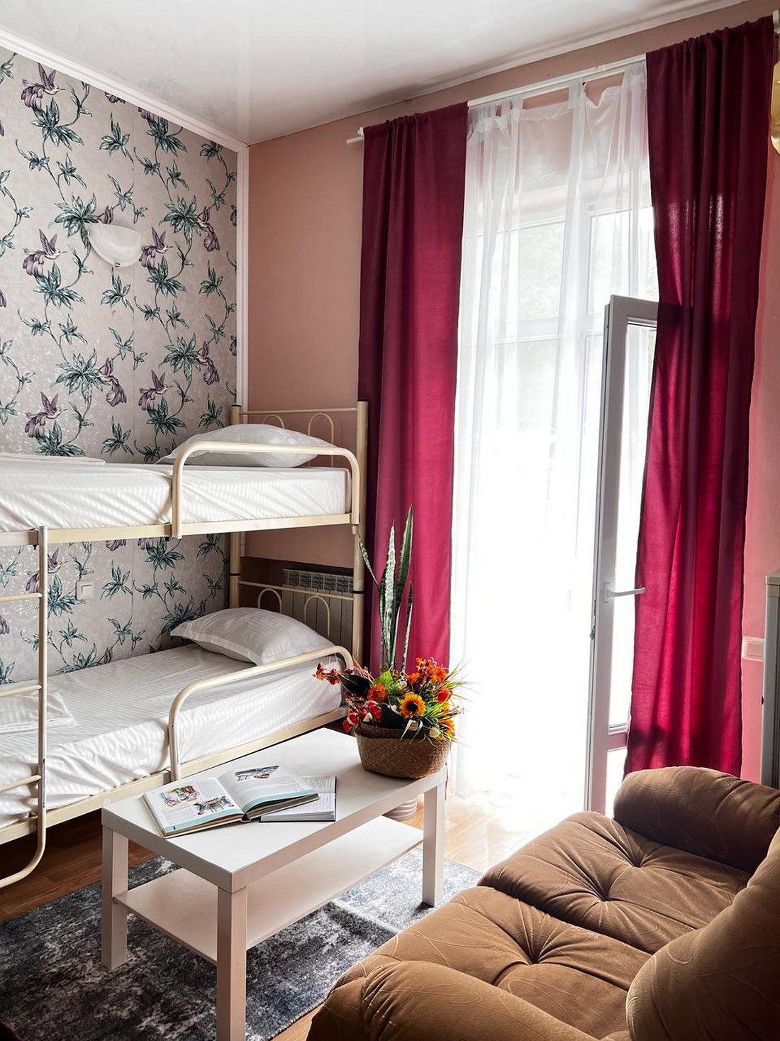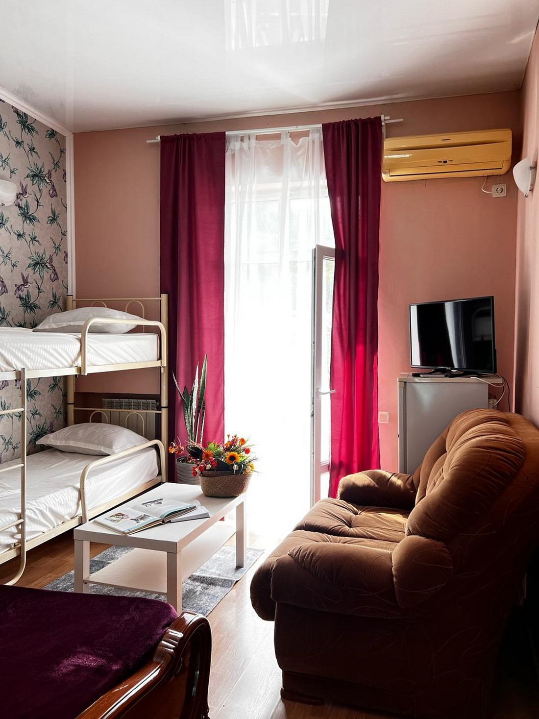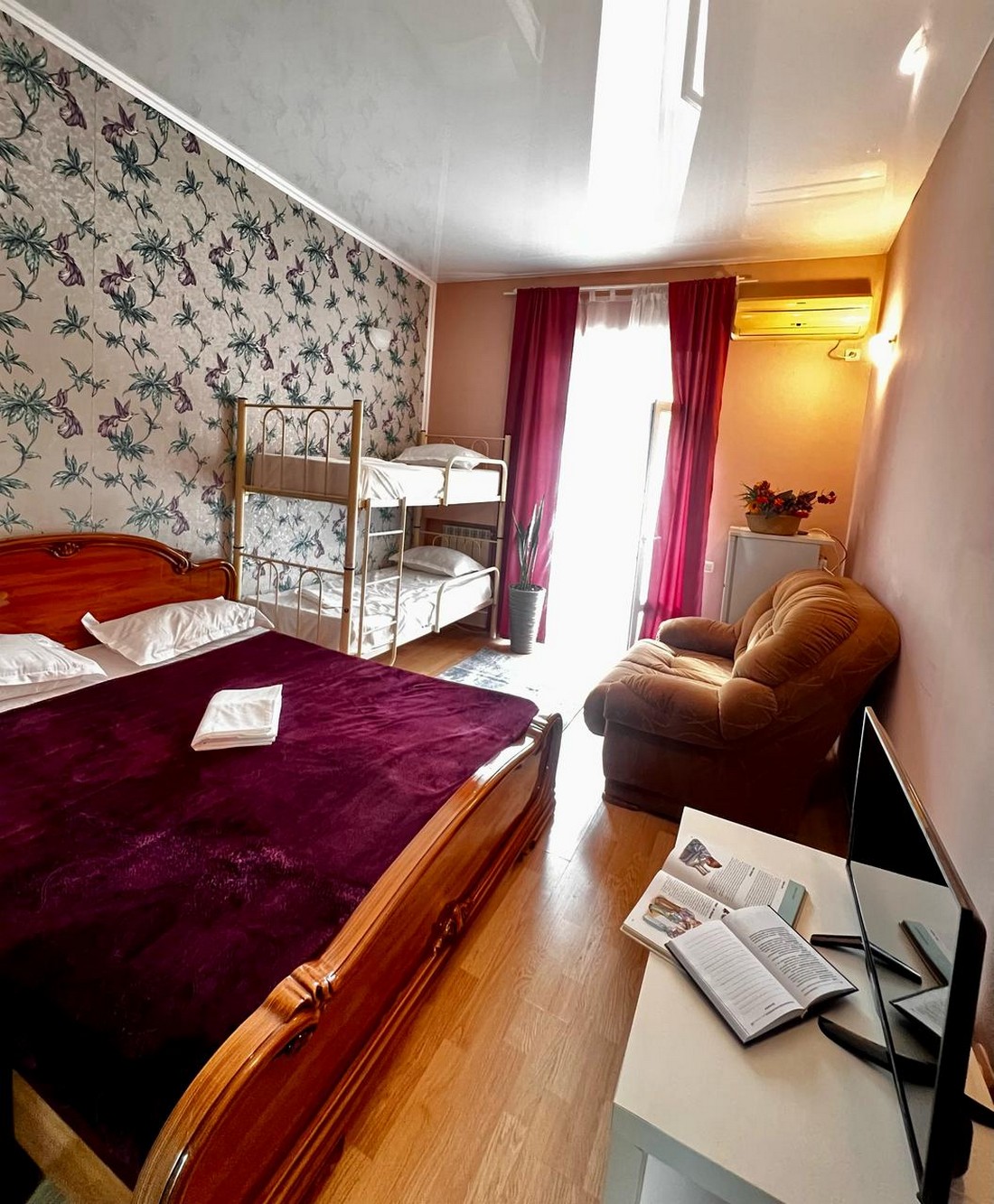 | Номер семейный 4-местный | 20 кв.м. | 4 чел. | Мебель (вешалка, зеркало, кресло-кровать, кровать двуспальная, кровать двухъярусная, прикроватные ту... | |